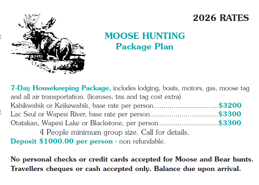 Please note that no personal checks or credit cards accepted for Moose and Bear hunts. Travellers cheques or cash accepted only. Balance due upon arrival.