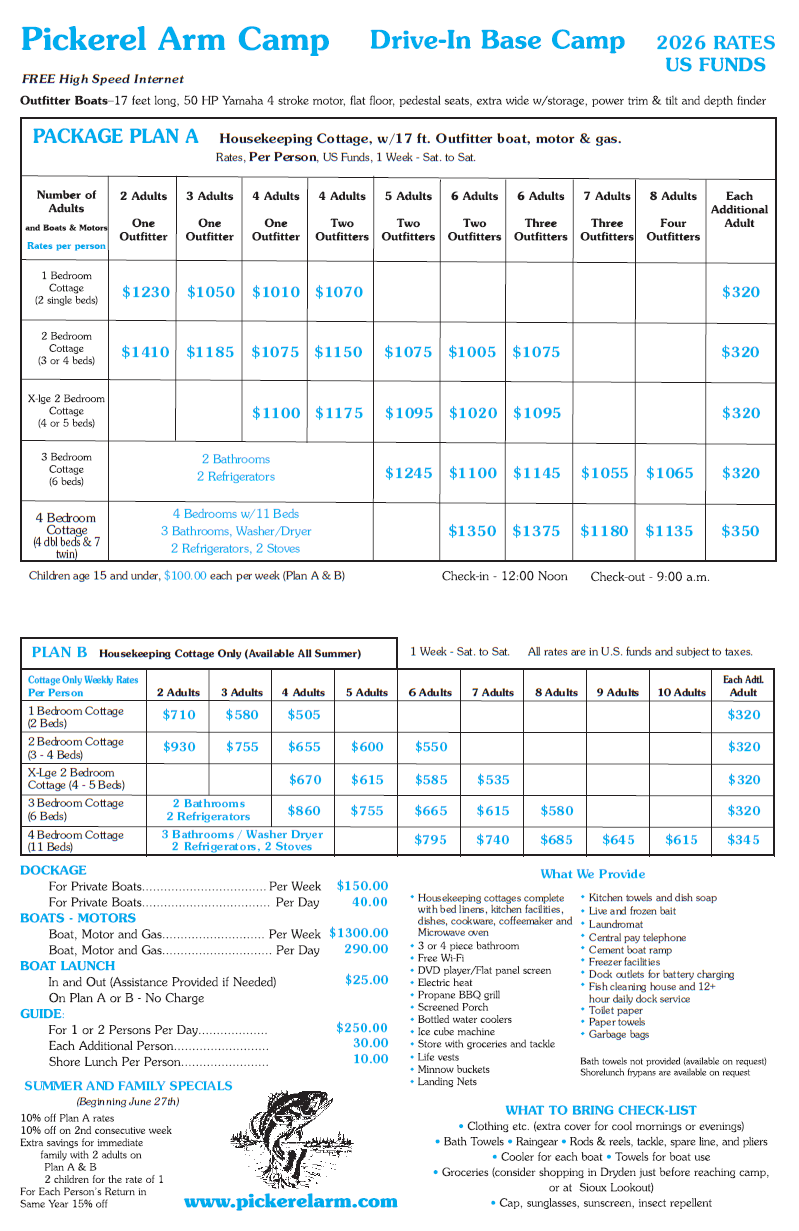 Pickerel Arm Camps DRIVE-IN BASE CAMP 2026 RATES (US FUNDS) Click the rates image for a larger version or click here |